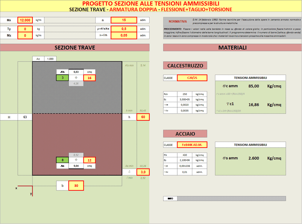 PROGETTO SEZIONE TRAVE a Momento Flettente ad ARMATURA SEMPLICE o DOPPIA con presenta concomitante di taglio e momento torcente. [cod. PRO_TA04]