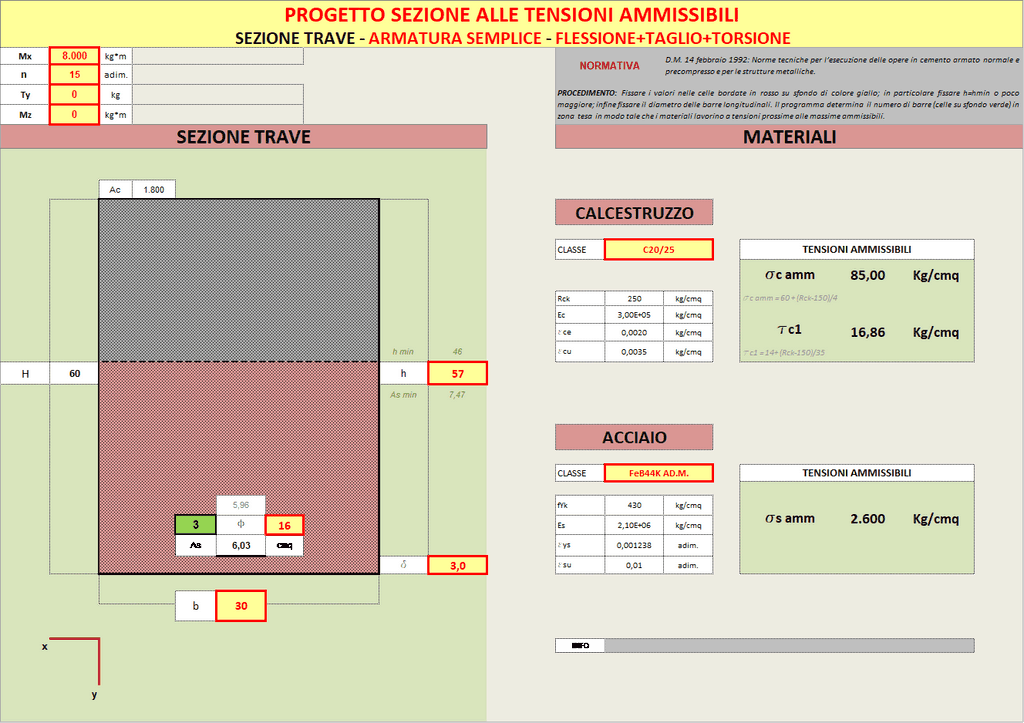 Il programma si compone di due moduli per la progettazione di una sezione di trave in cemento armato alle Tensioni Ammissibili in accordo alle prescrizioni del D.M. 14 febbraio 1992 e s.m.i. sottoposta a Momento Flettente con presenza concomitante di Taglio e Momento Torcente. I dati vengono inputati direttamente sulle entità grafiche cui si riferiscono.