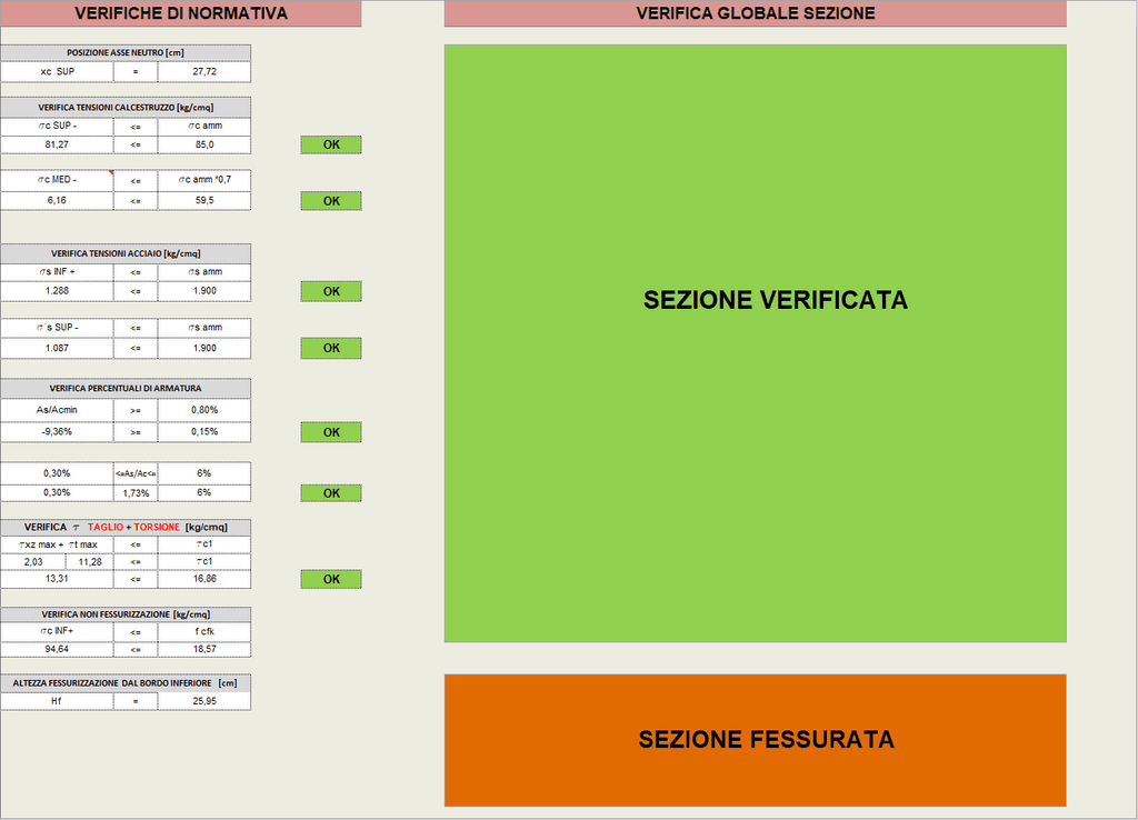 Infine effettua il check sul rispetto di tutte le prescrizioni della normativa; in caso di mancata verifica segnala la prescrizione violata mediante attivazione di celle su sfondo di colore rosso in corrispondenza della prescrizione violata per consentire al progettista di intervenire per ovviare alla mancata verifica.