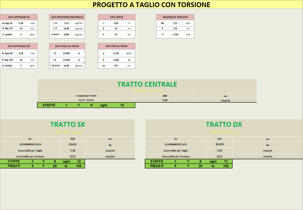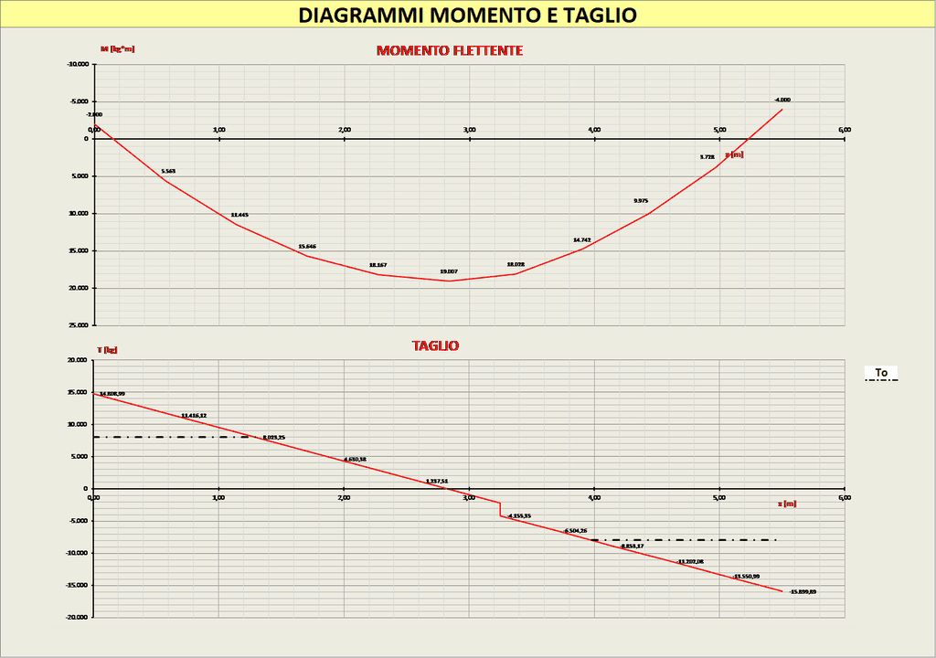 Il programma restituisce i diagrammi del Momento Fettente e del Taglio e indica in particolar modo, su quest'ultimo, il valore del taglio To corrispondente alla tensione tangenziale Tauc0. Inoltre effettua il progetto delle staffe e dei ferri piegati diversificando i tratti della trave in cui la tensione tangenziale di taglio o di taglio e torsione (nel caso di presenza anche di torsione) è inferiore a Tauc0 o superiore a Tauc0. Nel primo caso (sezione di mezzeria della trave) il programma calcola e inserisce l'armatura staffante regolamentare determinando il passo delle staffe sulla base dei riferimenti normativi; nel secondo caso (tratti di estremità della trave) calcola lo scorrimento tagliante e determina in funzione di questo il passo delle staffe e il numero di piegati (nal caso in cui una parte dello scorrimento venga affidato ai piegati) necessari; in particolar modo il passo delle staffe è il minimo valore tra quello rinveniente dal calcolo di assorbimento dello scorrimento tagliante e quello minimo stabilito dalla normativa.