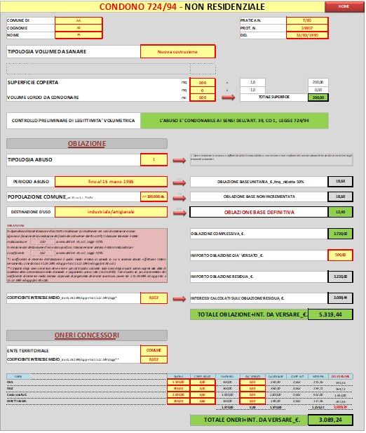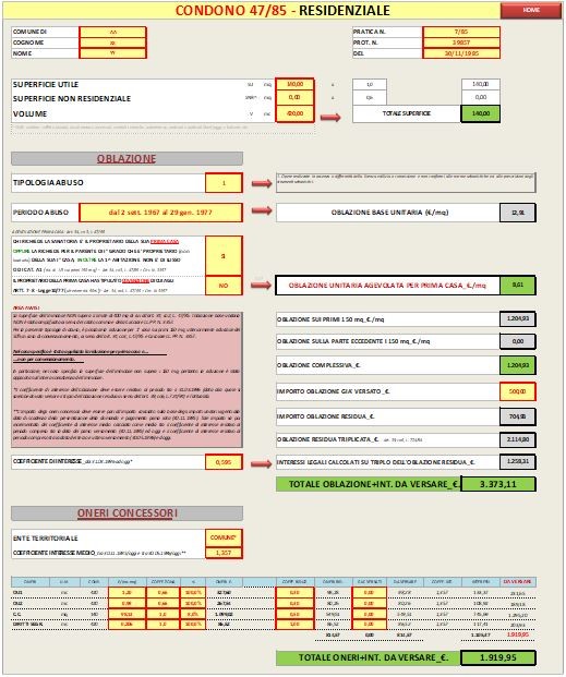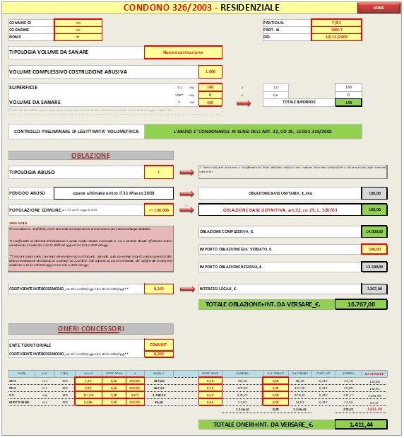 Il programma "Liquidazione pratiche di condono. Definizione sanatoria edilizia ai sensi delle leggi 47/85, 724/94, 326/03” in excel effettua il calcolo dell’oblazione e degli oneri concessori residui relative a pregresse pratiche di condono edilizio per le quali i versamenti degli importi non sono stati completamente eseguiti nei termini di legge statuiti dalle norme.