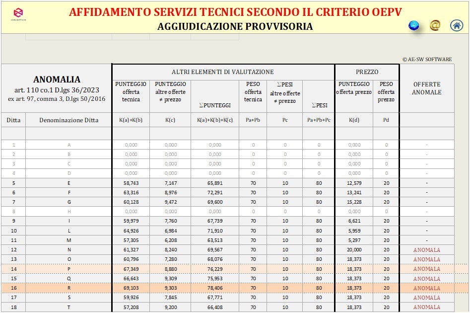 Nella determinazione del punteggio relativo al criterio "prezzo" la formula impiegata è di tipo bilineare cosi come richiesto dalla normativa vigente. Il programma consente l’individuazione dell’aggiudicatario provvisorio e la individuazione delle offerte anomale secondo quanto stabilisce la normativa vigente.