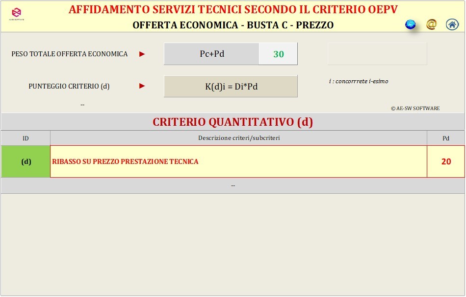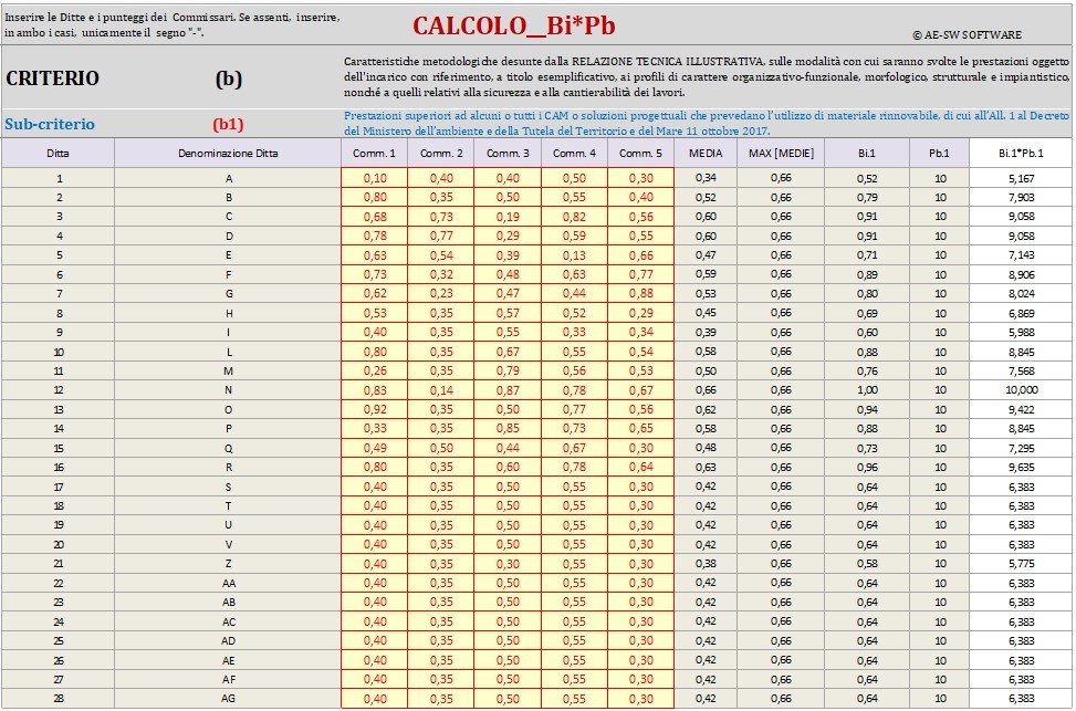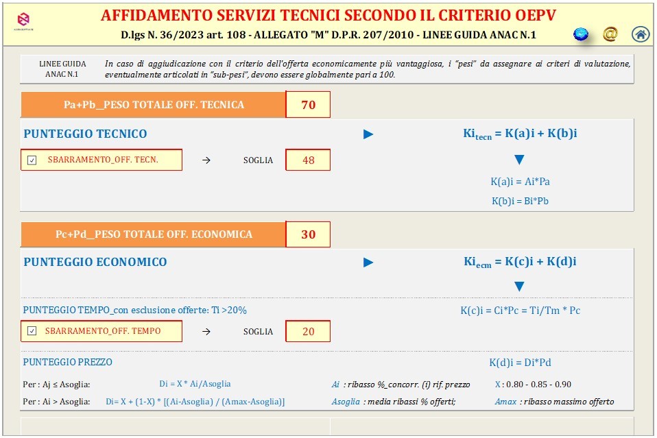 Il programma “Affidamento servizi di architettura e ingegneria. Programma in excel per l’aggiudicazione di gare d’appalto secondo il criterio dell’offerta economicamente più vantaggiosa” determina l‘aggiudicazione di gare d’appalto di servizi di architettura e ingegneria secondo il criterio del miglior rapporto qualità/prezzo in conformità alle prescrizioni di cui all’art. 108 del D.lgs n. 36/2023 secondo il metodo aggregativo-compensatore di cui all’Allegato M al D.P.R. 207/2010, e sulla base degli orientamenti delle Linee Guida ANAC N. 1 recanti “Indirizzi generali sull’affidamento dei servizi attinenti all’architettura e all’ingegneria” e Linee Guida ANAC N. 2 recanti “Offerta economicamente più vantaggiosa”.