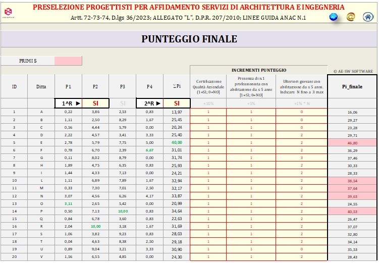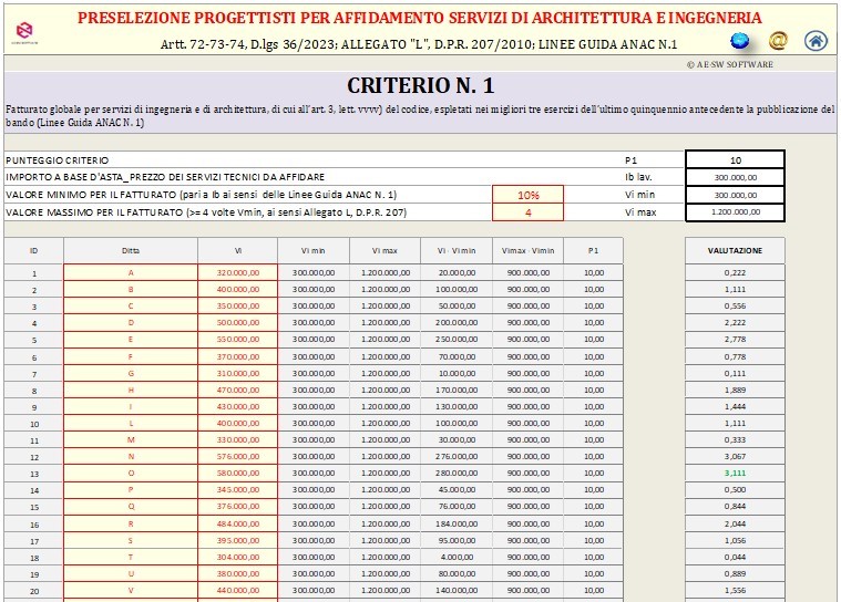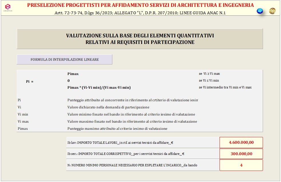 Il programma "Preselezione progettisti per l'affidamento di servizi di architettura e ingegneria. Programma in excel per la preselezione dei partecipanti. Procedure ristrette - competitive con negoziazione - dialogo competitivo" consente di eseguire la preselezione di concorrenti progettisti da invitare in una gara d’appalto di servizi, relativa all’affidamento di prestazioni tecniche di architettura e ingegneria nelle procedure ristrette, competitive con negoziazione, dialogo competitivo mediante il metodo dell’interpolazione lineare in conformità alle prescrizioni di cui agli artt. 72, 73, 74 del D.lgs 36/2023, Allegato L al D.P.R. 207/2010 e secondo gli orientamenti delle Linee Guida ANAC N. 1 recanti “Indirizzi generali sull’affidamento dei servizi attinenti all’architettura e all’ingegneria”, approvate dal Consiglio dell’Autorità con Delibera n. 973 del 14 settembre 2016 e s.m.i..