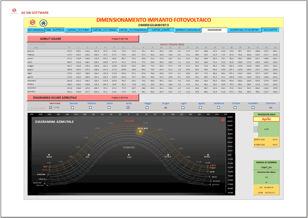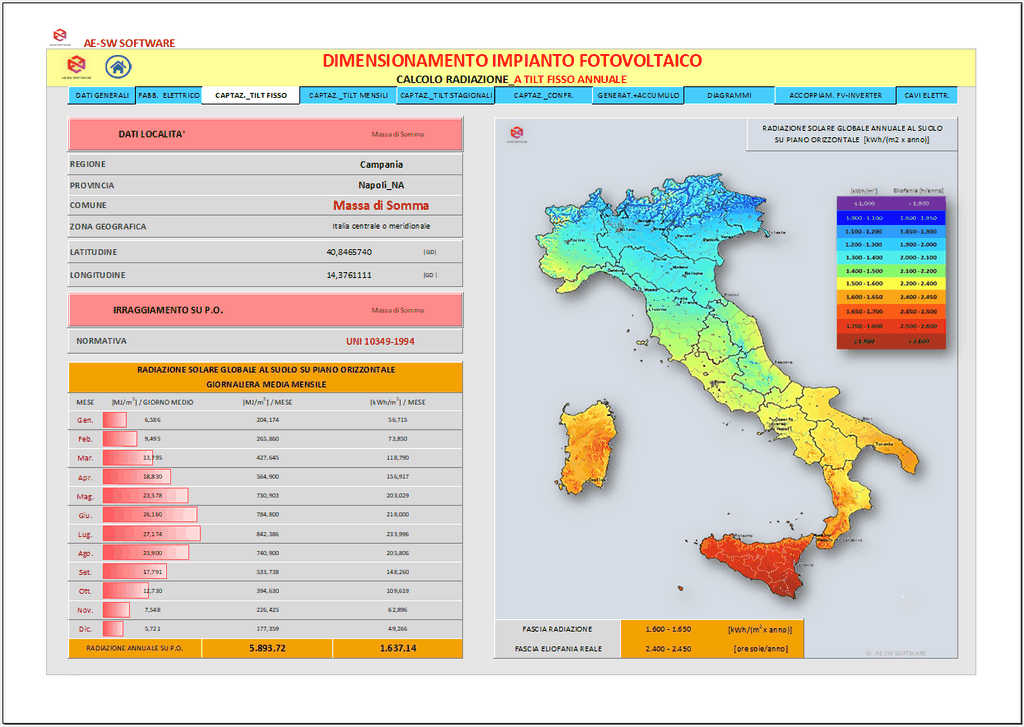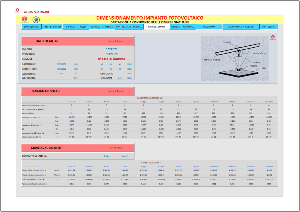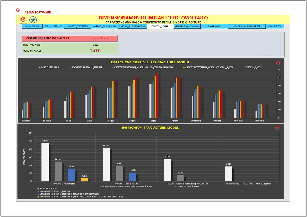 Il programma consente di effettuare l’analisi della captazione solare diretta e diffusa sul piano dei moduli secondo le predette giaciture, per ciascun mese dell’anno.