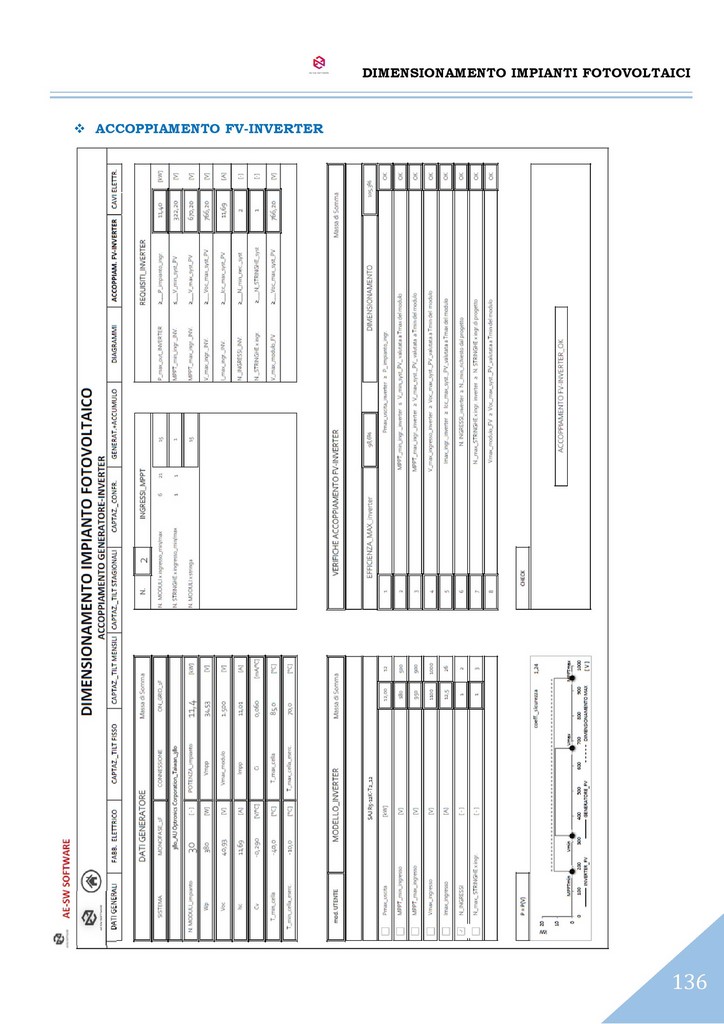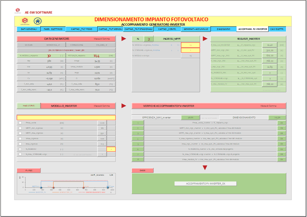 Altra sezione del programma è dedicata al dimensionamento dell’accumulatore (batteria) e alla scelta dell’accoppiamento generatore/inverter con le opportune verifiche di compatibilità tra lo stato tensionale ed elettrico di sistema e i corrispondenti valori riportati sulle schede tecniche dell'inverter di progetto.