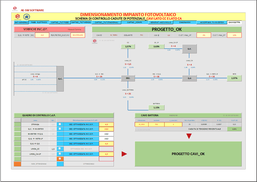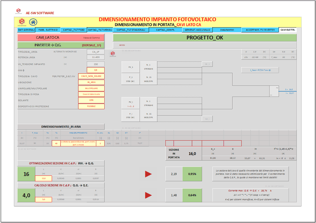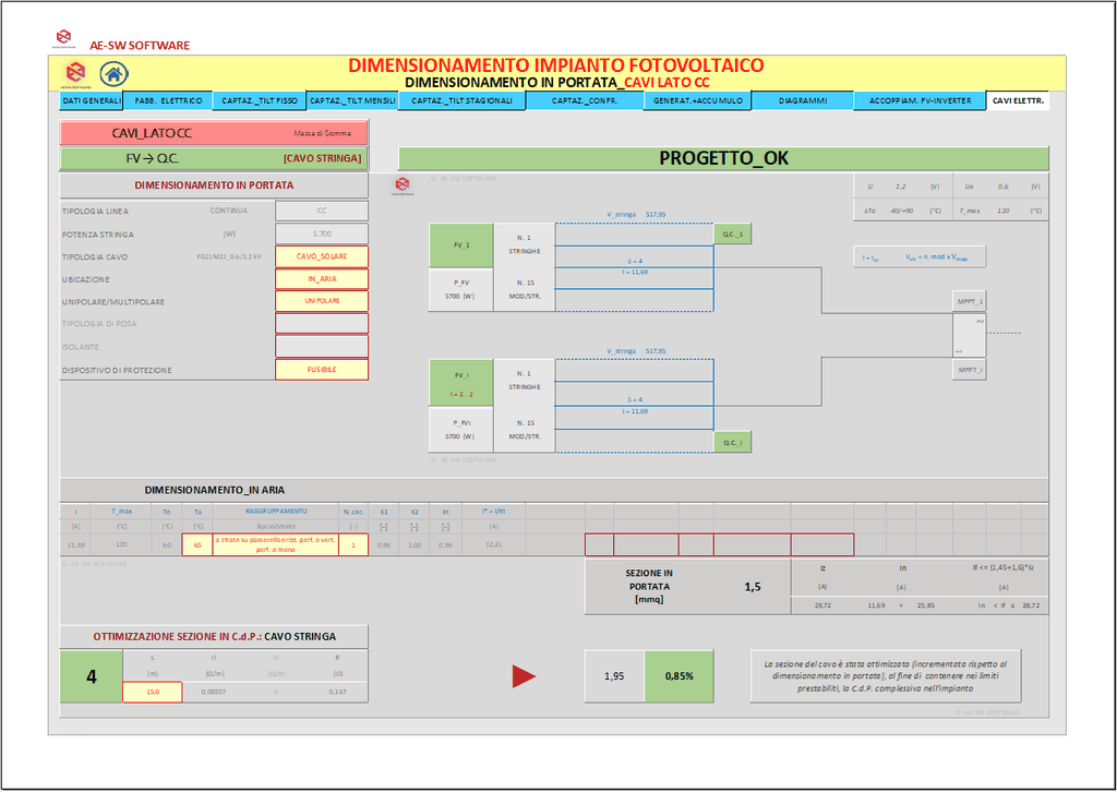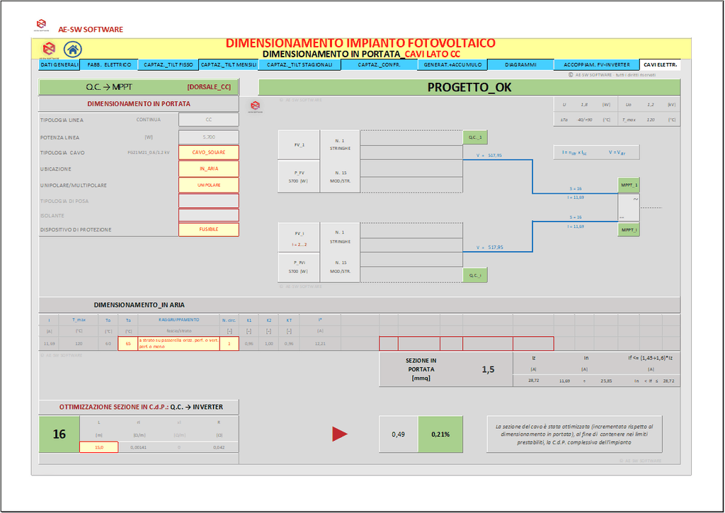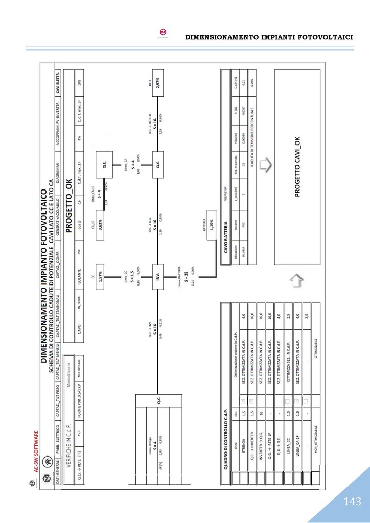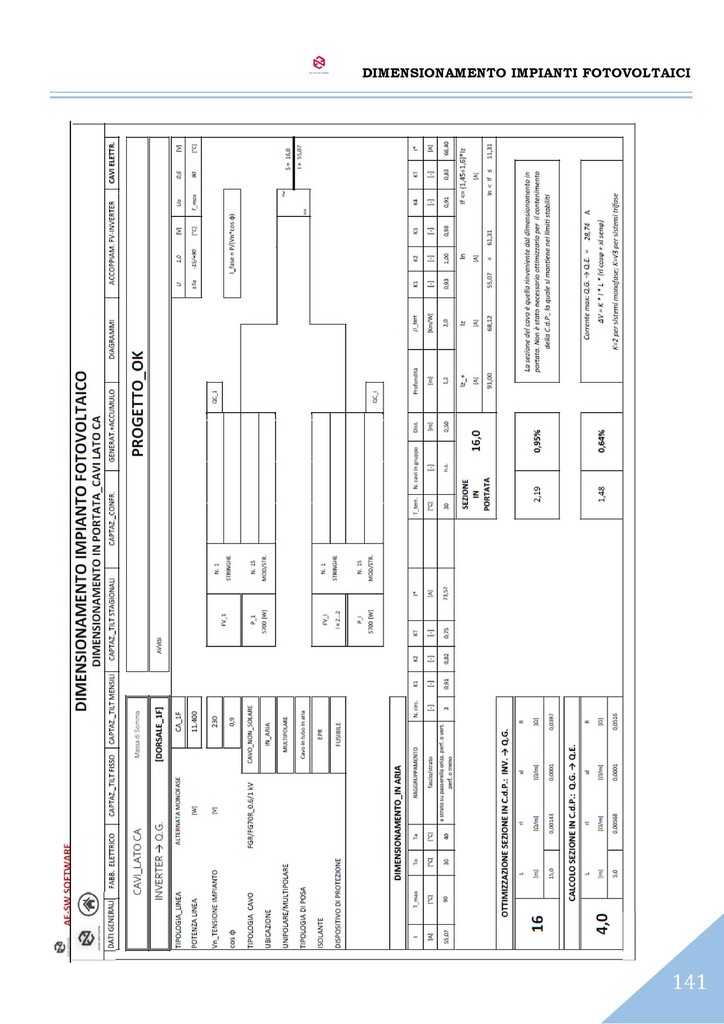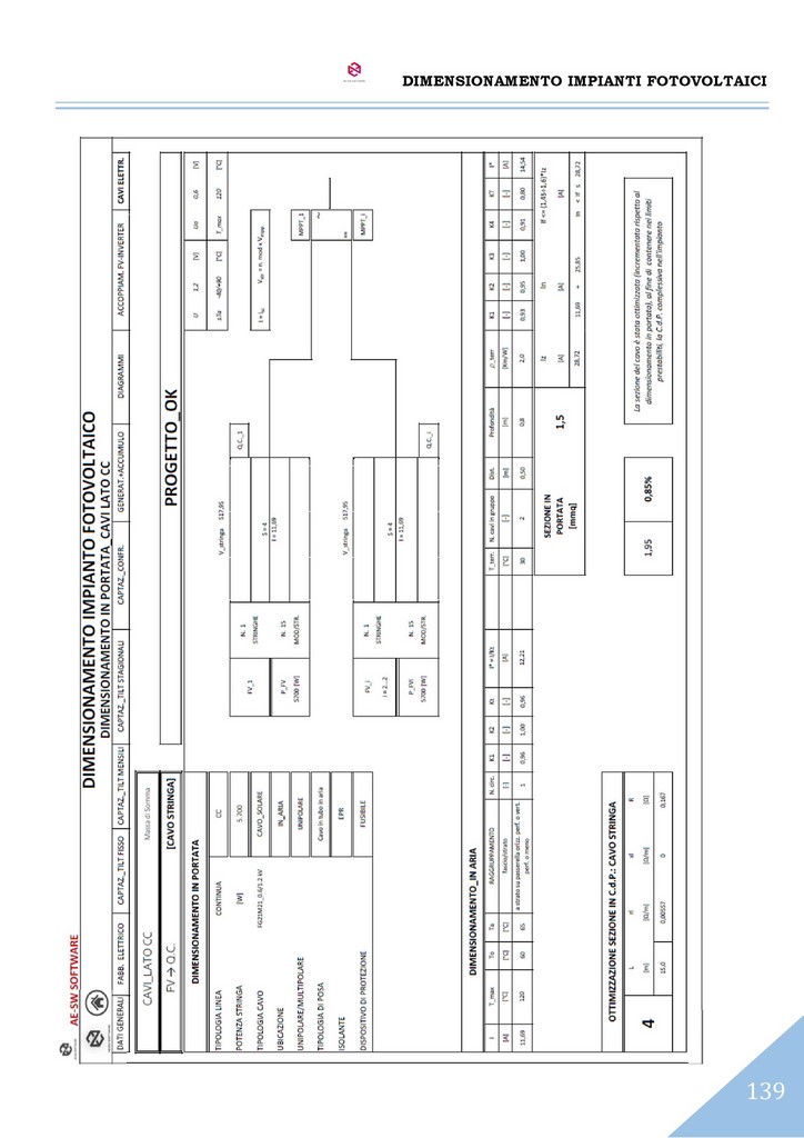 A conclusione del dimensionamento, è effettuato il calcolo dell’impianto elettrico del sistema con il reperimento delle sezioni dei cavi sia sul lato CC che sul lato CA secondo il metodo del dimensionamento in portata di cui alle norme CEI-UNEL e altresì secondo il metodo del dimensionamento in caduta di potenziale massima ammissibile.