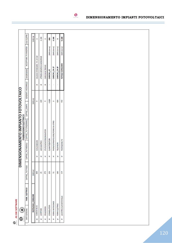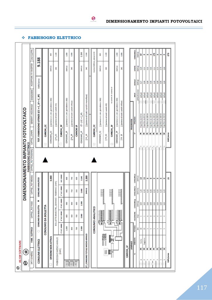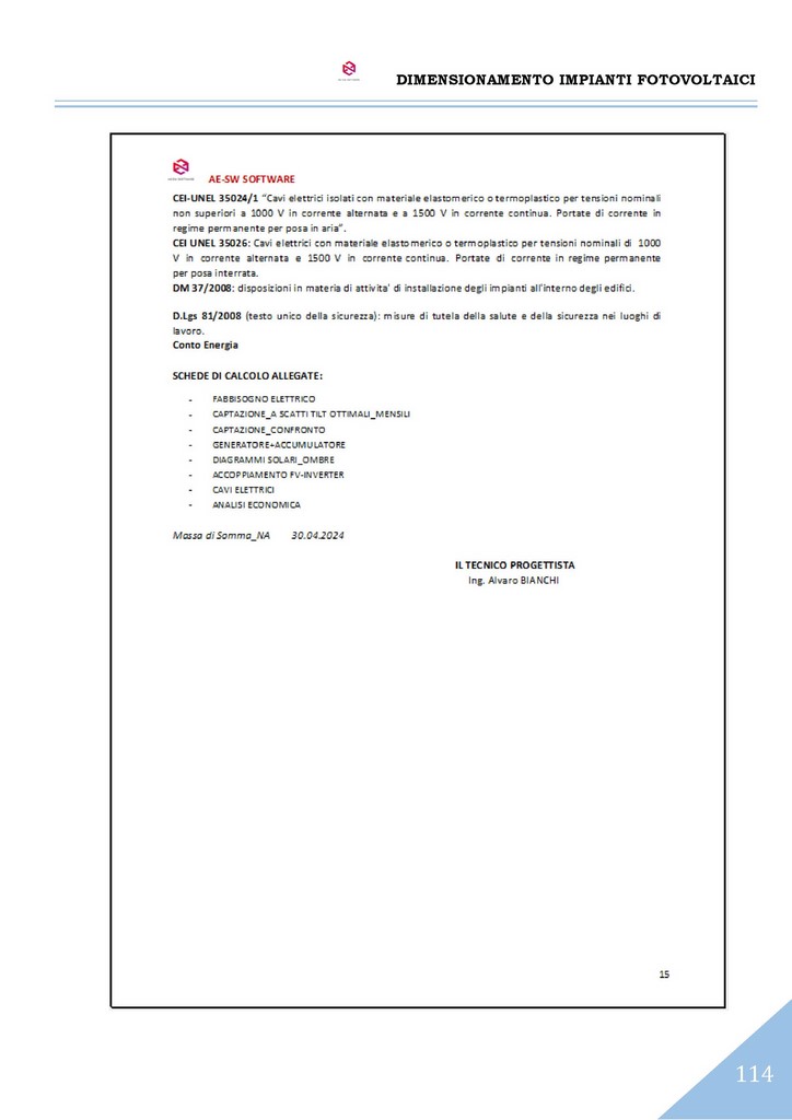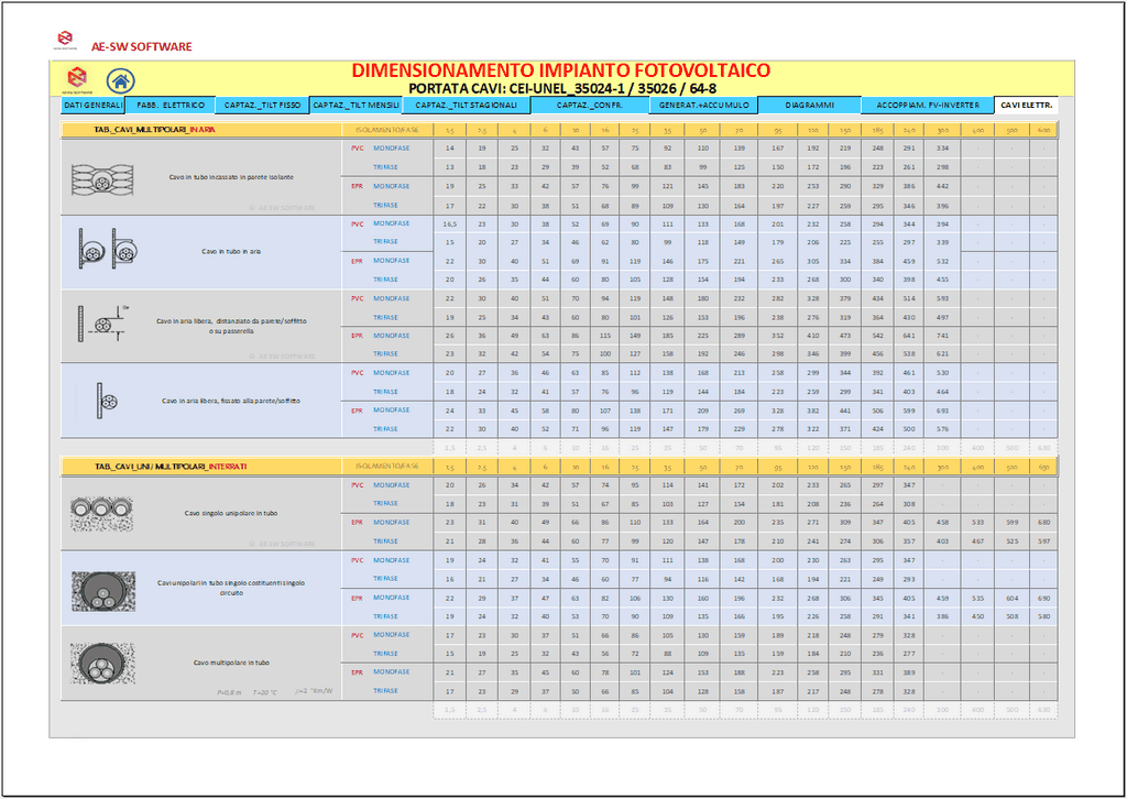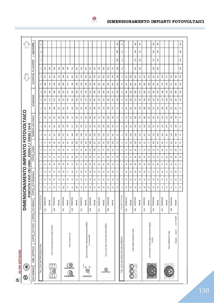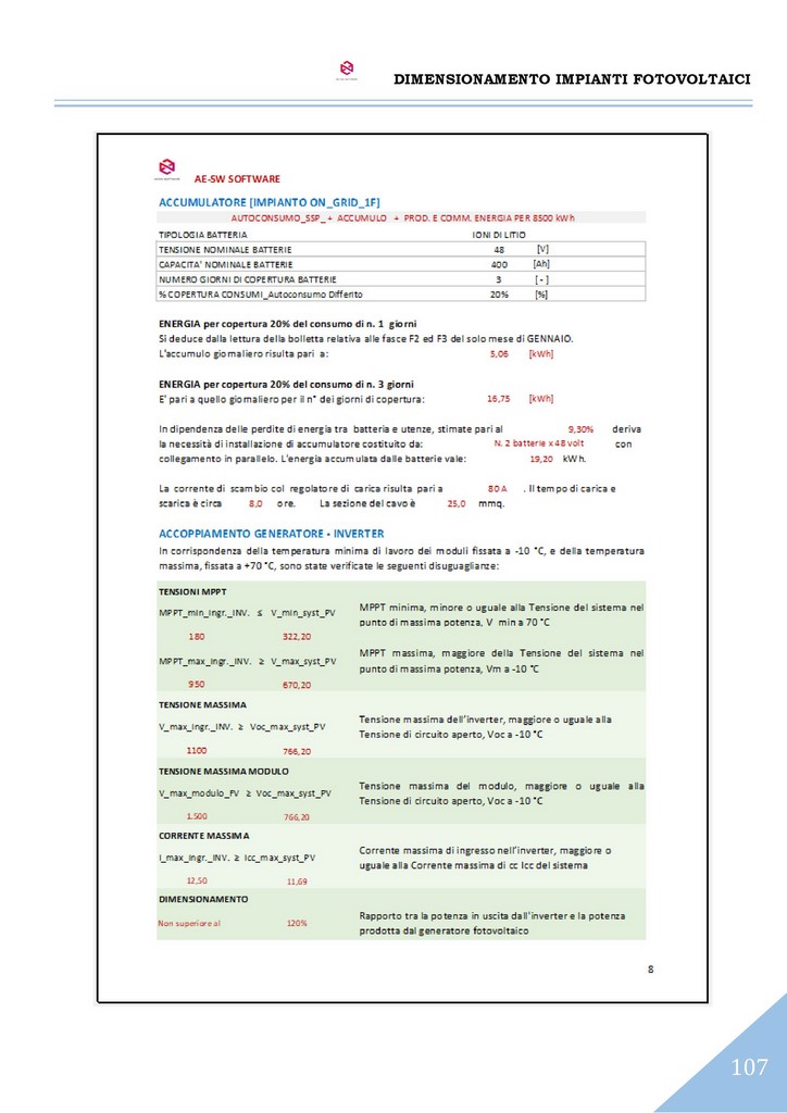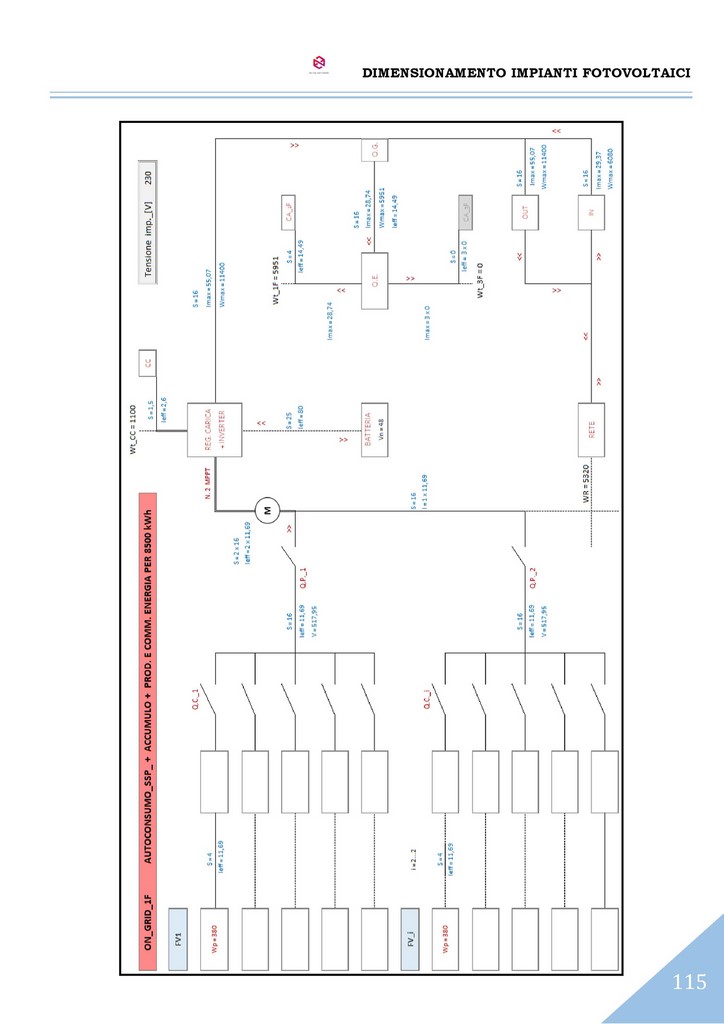 A conclusione del dimensionamento, è effettuato il calcolo dell’impianto elettrico del sistema con il reperimento delle sezioni dei cavi sia sul lato CC che sul lato CA secondo il metodo del dimensionamento in portata di cui alle norme CEI-UNEL e altresì secondo il metodo del dimensionamento in caduta di potenziale massima ammissibile.