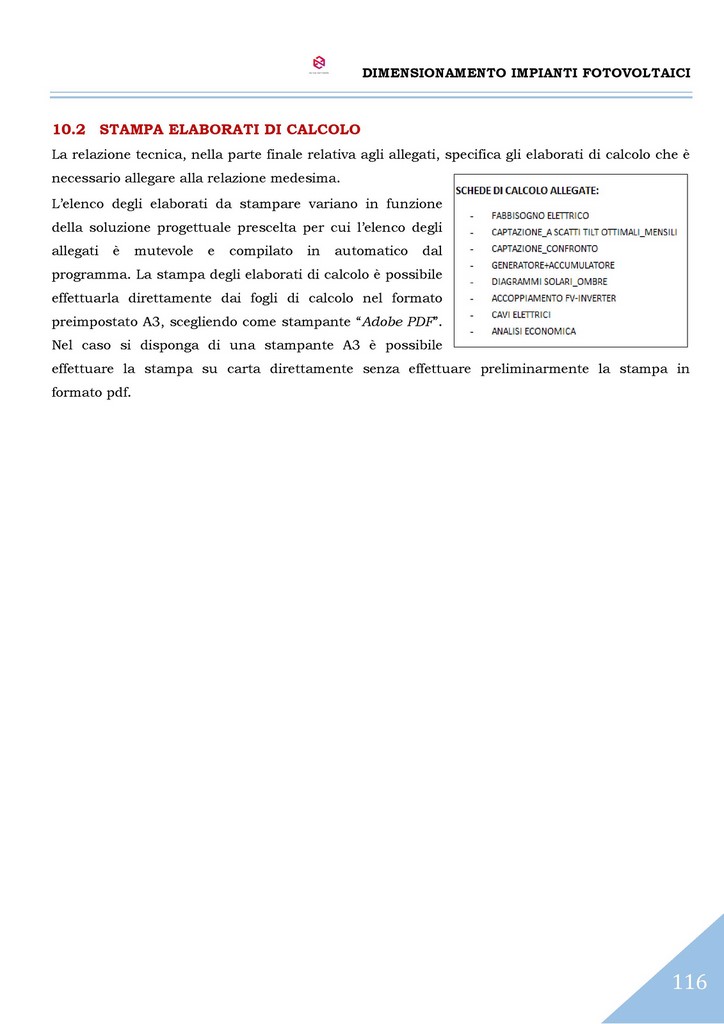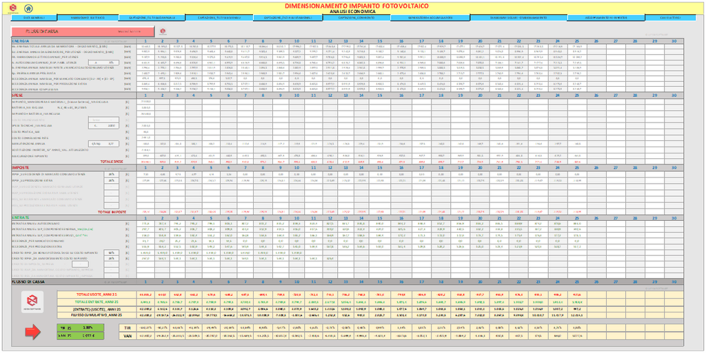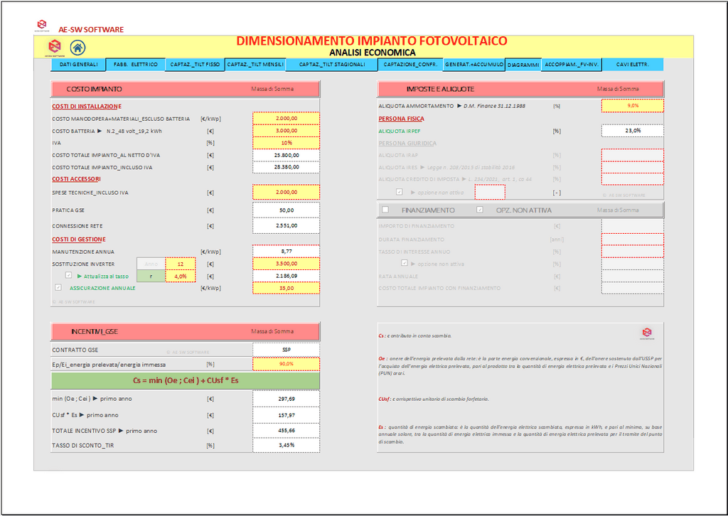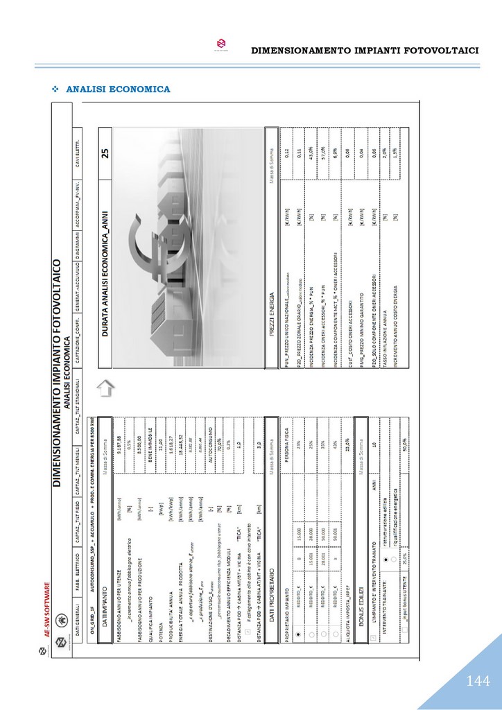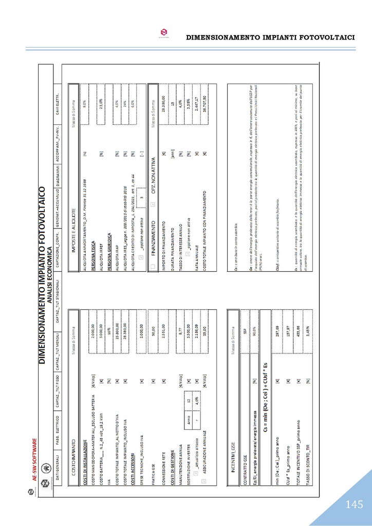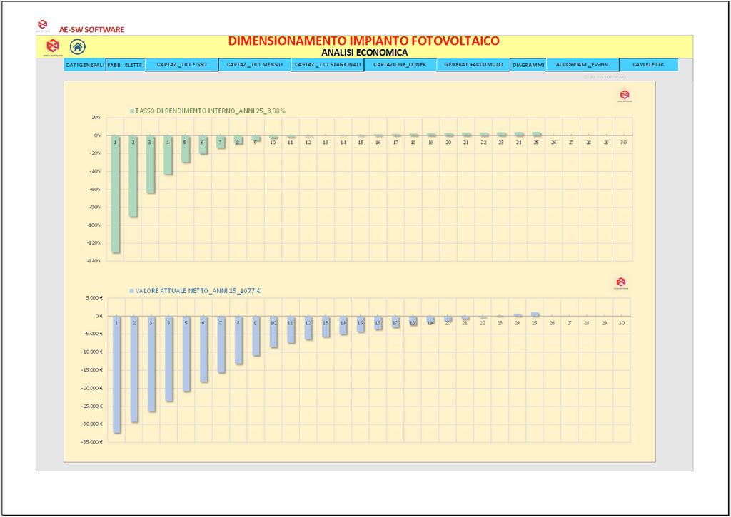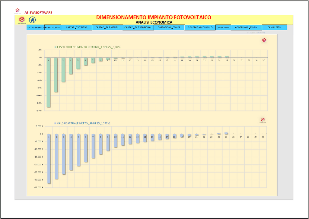 Infine è effettuata l’analisi economica dell’investimento con il calcolo del tempo di rientro, del tasso interno di rendimento (TIR) e del valore attuale netto (VAN) con illustrazione del loro andamento nel tempo mediante grafici. Il programma è predisposto per la stampa di tutto ciò che è visibile a schermo in formato cartacero o pdf. Infine esegue l'autocompilazione della Relazione Tecnica, tra le più dettagliate e complete dei software attualmente presenti sul mercato.