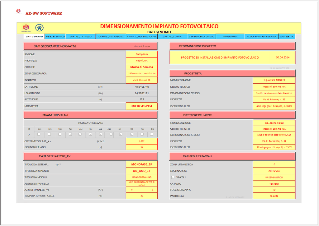 Il generatore fotovoltaico FV è costituito da moduli selezionabili dall’utente da elenco a discesa e orientabili nello spazio secondo un qualsiasi angolo azimutale e secondo le seguenti giaciture: