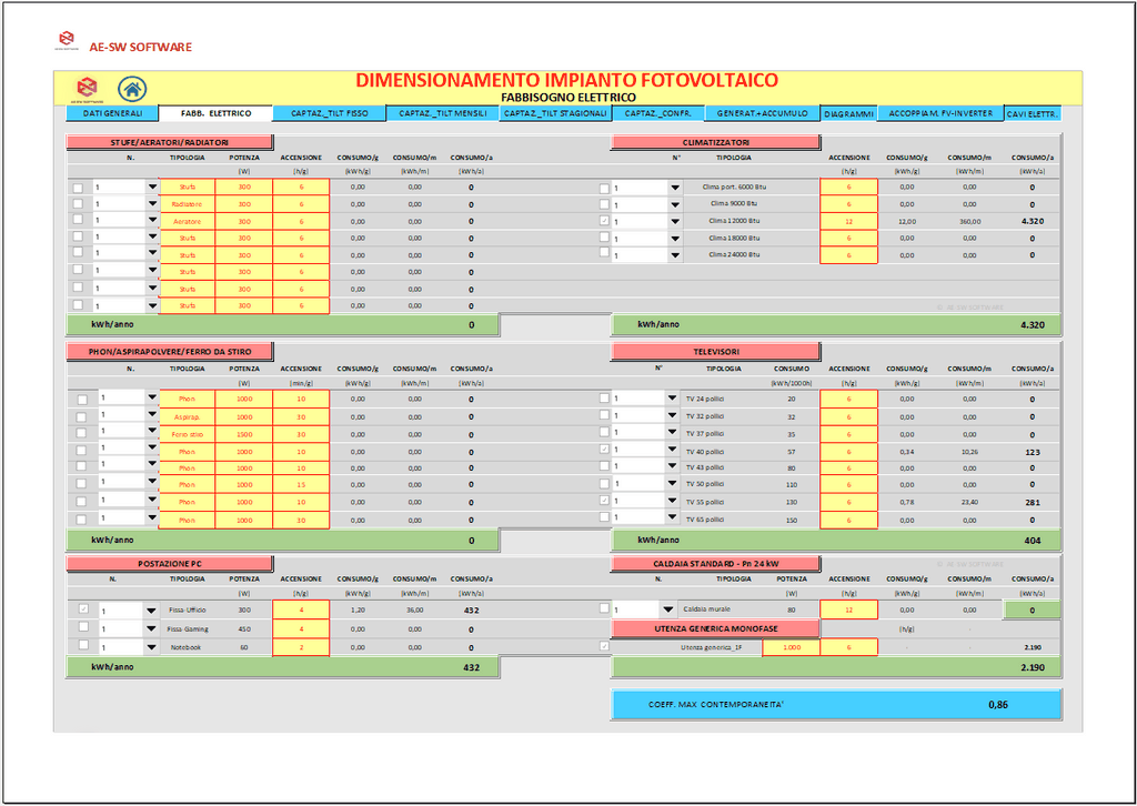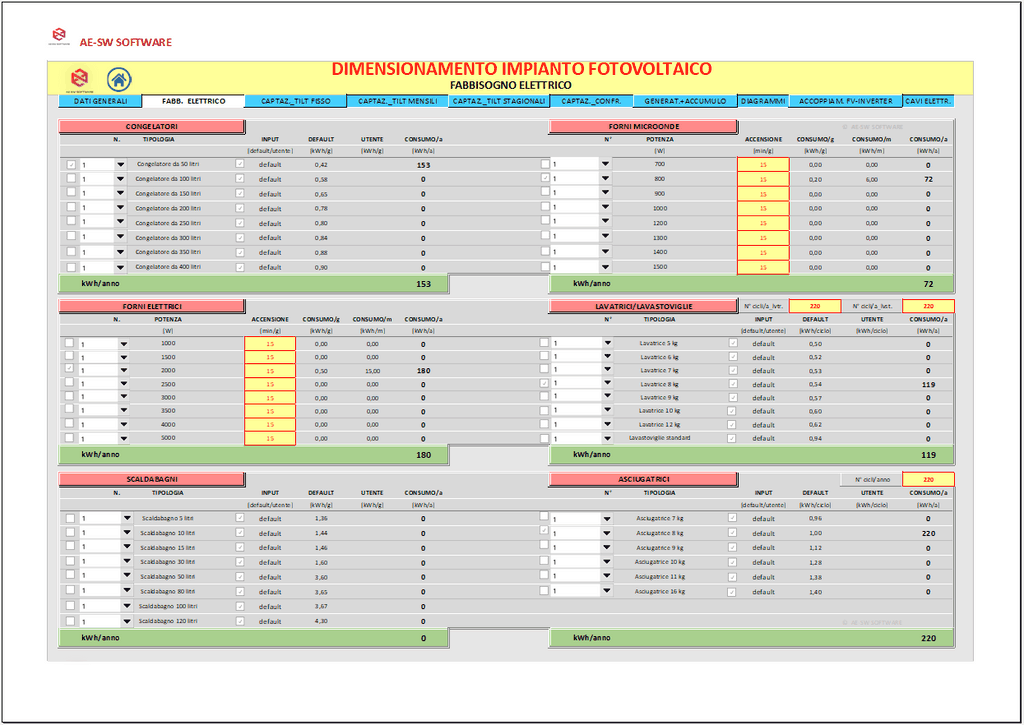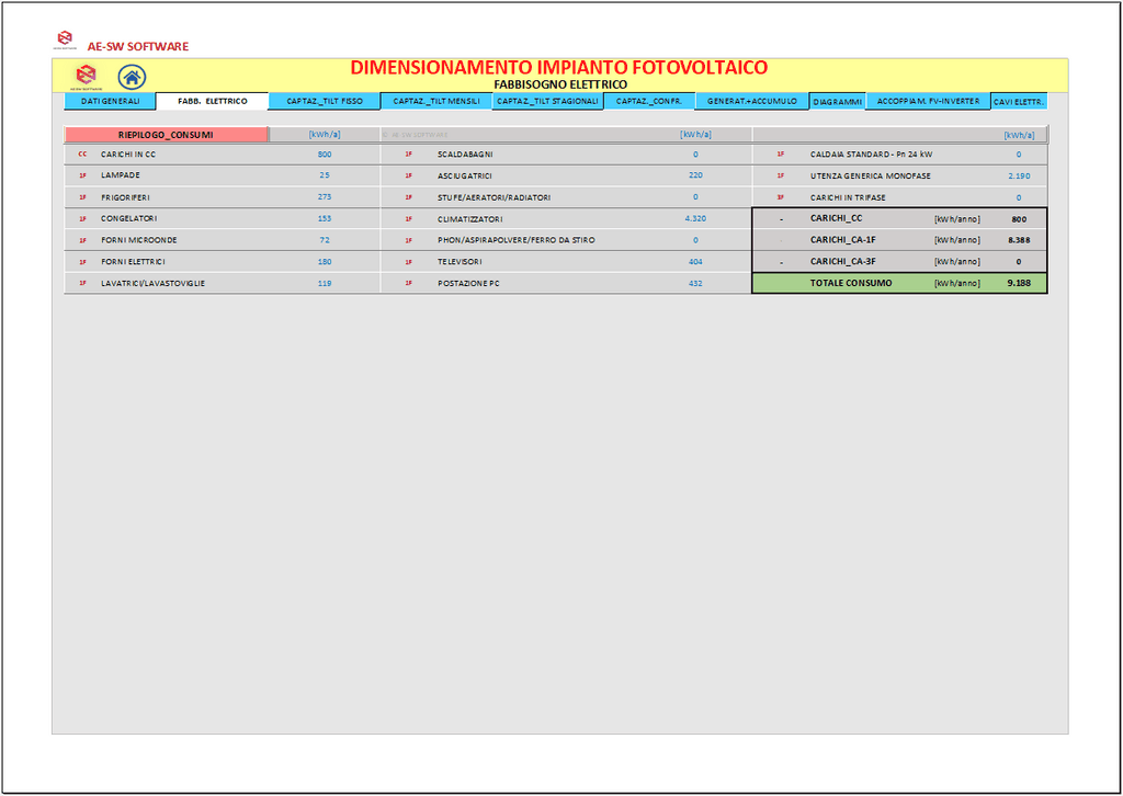 Il programma "Dimensionamento impianti fotovoltaici. Programma in excel per il calcolo di impianti fotovoltaici monofase e trifase. Impianti off-grid; on-grid; ibridi" esegue il dimensionamento di impianti fotovoltaici monofase o trifase di tipo off-grid, on-grid, ibridi.