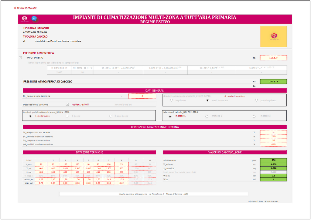 Il calcolo è condotto a umidità specifica di immissione controllata e può essere riferito a edifici pubblici o privati; residenziali o meno. I parametri psicrometrici dell’aria sono calcolati in funzione dei diversi valori che la pressione atmosferica assume in dipendenza dell’ubicazione geografica della località. La pressione atmosferica (se nota) può essere inputata direttamente dal progettista; ovvero può essere calcolata dal programma in funzione della quota dell’edificio e della temperatura esterna esistente a quella quota.