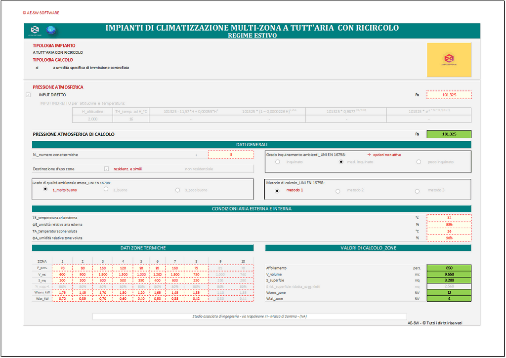 Il calcolo è condotto a umidità specifica di immissione controllata e può essere riferito a edifici pubblici o privati; residenziali o meno. I parametri psicrometrici dell’aria sono calcolati in funzione dei diversi valori che la pressione atmosferica assume in dipendenza dell’ubicazione geografica della località. La pressione atmosferica (se nota) può essere inputata direttamente dal progettista; ovvero può essere calcolata dal programma in funzione della quota dell’edificio e della temperatura esterna esistente a quella quota.