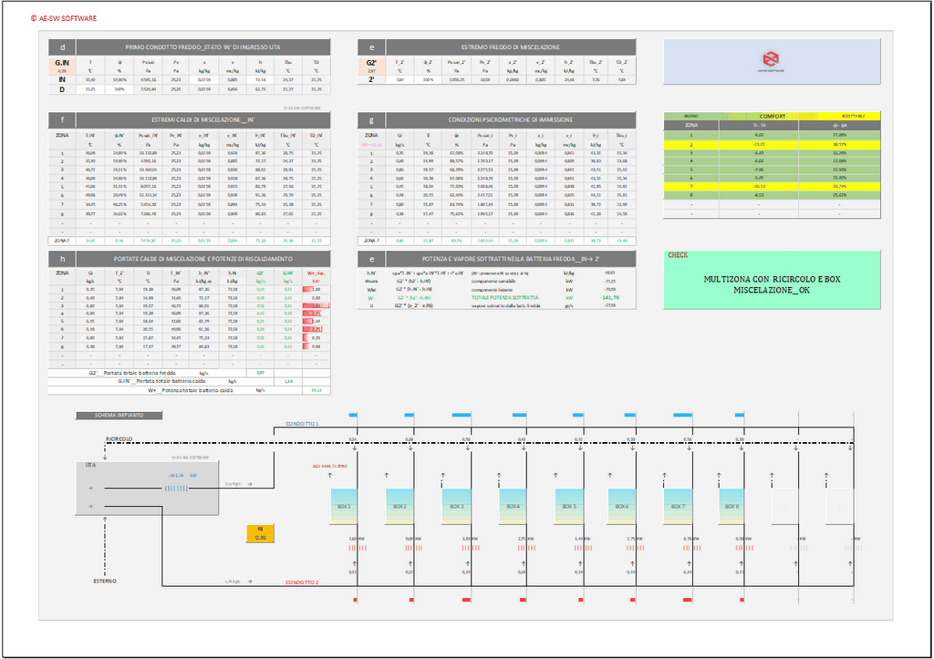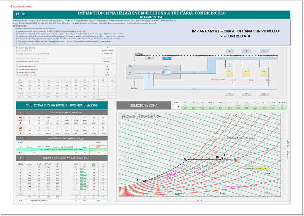 Programma in excel per il dimensionamento di impianti di climatizzazione multi-zona a tutt'aria con ricircolo e box miscelazione. [cod. ED14]
