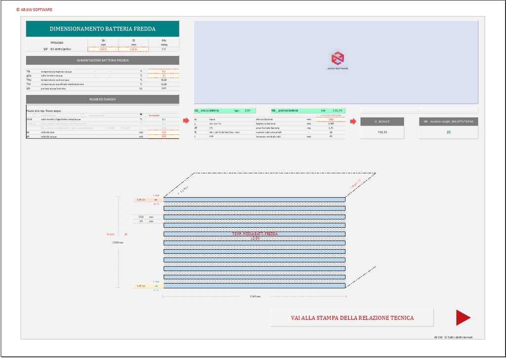Il dimensionamento è condotto analiticamente con calcoli numerici e rappresentato su diagramma psicrometrico interattivo con il riporto delle trasformazioni termoigrometriche dell’aria in riferimento a ciascuna zona. È altresì eseguito il dimensionamento della batteria di raffreddamento con definizione delle dimensioni; del numero di tubi alettati; del loro interasse e del numero di ranghi.