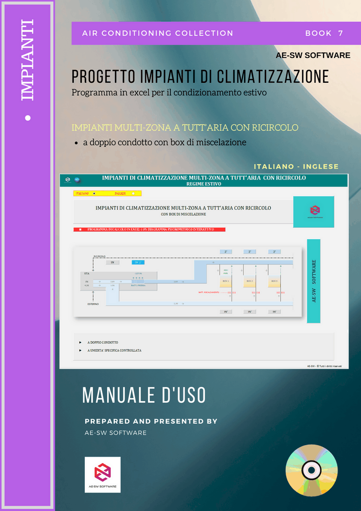 Il programma "Progetto impianti di climatizzazione a tutt'aria. Programma in excel per il dimensionamento di impianti multi-zona a tutt'aria con ricircolo e box miscelazione" in formato Excel, esegue il dimensionamento di impianti di climatizzazione estiva a tutt’aria con ricircolo e post-riscaldamento. L’impianto è del tipo “multi-zona” idoneo a climatizzare ambienti le cui condizioni termoigrometriche sono disomogenee e in quanto caratterizzati da diverse condizioni termoigrometriche.