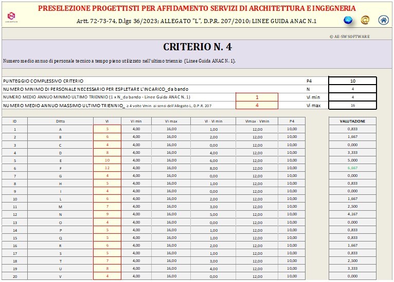 Il programma "Preselezione progettisti per l'affidamento di servizi di architettura e ingegneria. Programma in excel per la preselezione dei partecipanti. Procedure ristrette - competitive con negoziazione - dialogo competitivo" consente di eseguire la preselezione di concorrenti progettisti da invitare in una gara d’appalto di servizi, relativa all’affidamento di prestazioni tecniche di architettura e ingegneria nelle procedure ristrette, competitive con negoziazione, dialogo competitivo mediante il metodo dell’interpolazione lineare in conformità alle prescrizioni di cui agli artt. 72, 73, 74 del D.lgs 36/2023, Allegato L al D.P.R. 207/2010 e secondo gli orientamenti delle Linee Guida ANAC N. 1 recanti “Indirizzi generali sull’affidamento dei servizi attinenti all’architettura e all’ingegneria”, approvate dal Consiglio dell’Autorità con Delibera n. 973 del 14 settembre 2016 e s.m.i..